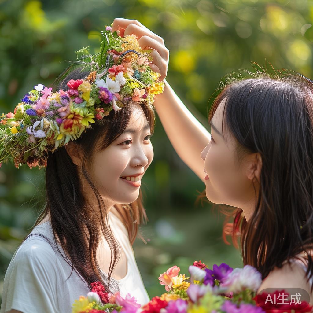 “看,我为你做的花环。”小芳把刚编织好的花环轻轻戴在小丽的头上,嘴角挂着自豪的微笑,那份纯真的友谊仿佛在这一刻凝固。小丽低头一看,五颜六色的小花在阳光下显得格外灵动,恰如她们之间的情感,简单却美好。
