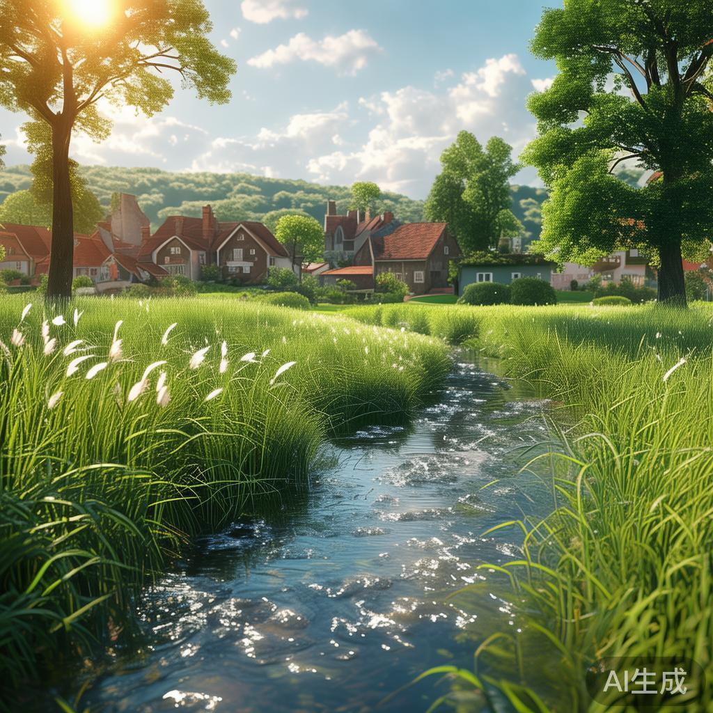 在一个阳光明媚的小村庄旁,有一片翠绿的草地,那里生长着许多高大的橡树和纤细的芦苇。小溪静静流淌,水面上波光粼粼,为这幅美丽的画卷添上了一抹灵动的色彩。